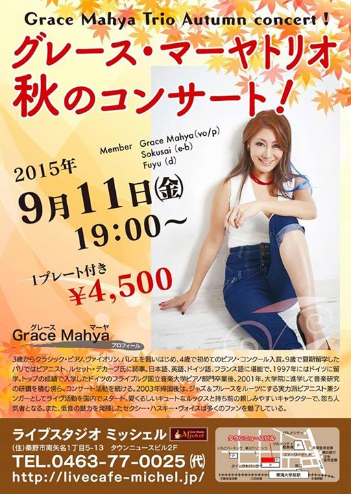明日9/11(金)はいよいよ、「グレース・マーヤトリオ秋のコンサート」です。