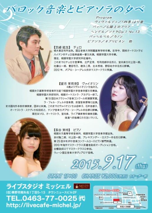 毎回違うテーマでのライブをしておりますが、今回はバロック音楽とピアソラの楽曲という、全く違う時代の曲を一晩にしてお届け致します♪