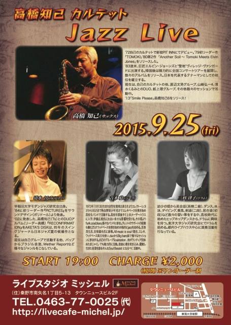 今夜9/24(金)19:00からは、高橋知己カルテットジャズライブです。
