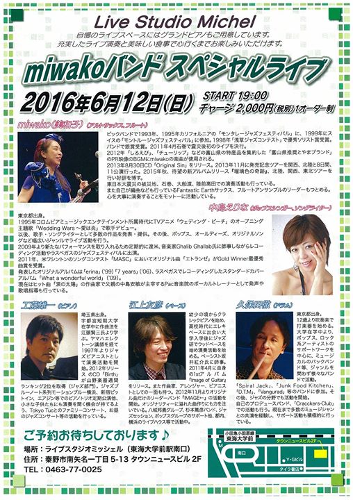 サックスのmiwakoさんをはじめ、都内を中心に活躍されている実力派メンバー揃いのバンドですので、必聴ですよー!
