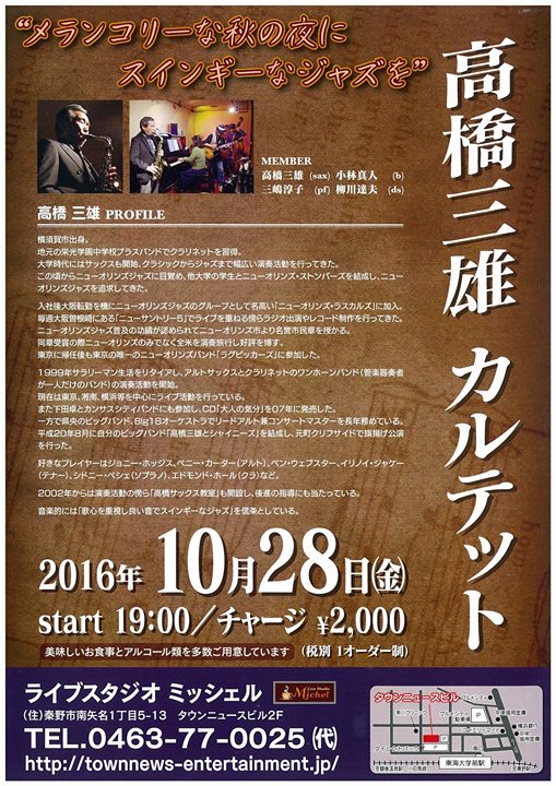 今夜19:00からは、高橋三雄カルテットによるジャズライブです。