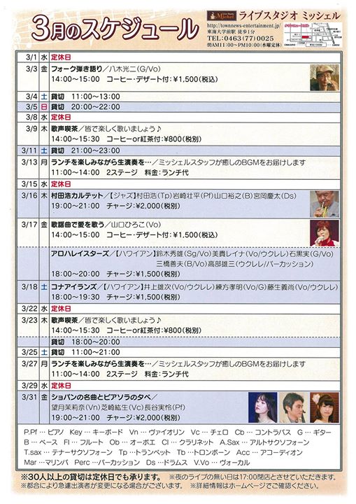 3月は、通常ライブの他に、ミッシェルスタッフがランチタイムにBGM演奏をお届けいたします♪
