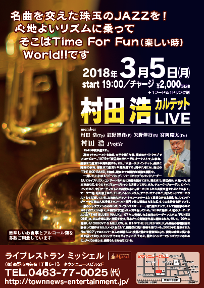 今夜、3/5(木)19:00からは、「村田浩カルテットジャズライブ」です!