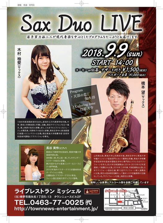 本日、9/9(日)14:00からは、Sax Duo Liveです!