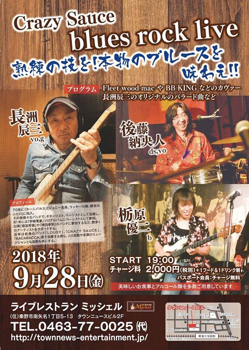 今夜9/28(木)19:00からはcrazy sauce による、ブルースロッククライブです。