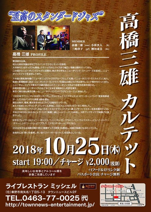 今夜19:00からは、高橋三雄カルテットによるジャズライブです。