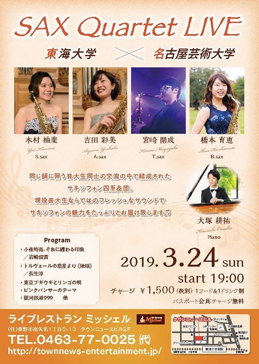 3/24(日) 19:00からは、サックスカルテットライブです✨