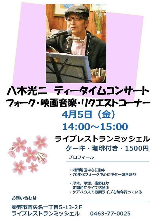 本日、14:00からは、「フォーク弾き語り」ティータイムコンサートです✨