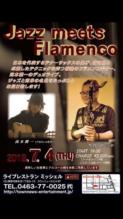 日本を代表するテナーサックスの鬼才、竹内直と卓越したテクニックを持つ情熱のフラメンコギター、高木潤一のデュオライブ!デュオならではの落ち着いた雰囲気と、ギターとサックスの熱い掛け合いの迫力!必聴です?!