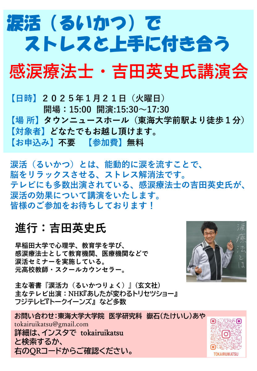 テレビにも多数出演されている、感涙療法士の吉田英史氏が、涙活の効果について講演いたします。皆様のご参加をお待ちしております!