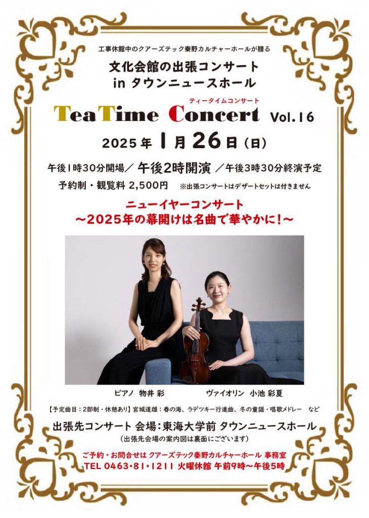 文化会館の出張コンサート in タウンニュースホール TeaTime Concert vol.15~秋の終わりのハーモニー~ 【日時】 2024年11月24日(日曜日) 13:30開場 14:00開演15:30終演予定(2部制・休憩あり) 【予約制・観覧料】 2,500円※出張コンサートはデ... -