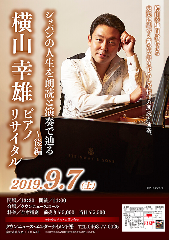 横山 幸雄 ショパンの人生を朗読と演奏で辿る〜後編 チケット先行販売のお知らせ 横山幸雄自身による史実に基づく新たな書き下ろしの物語の朗読と演奏。 2019年9月7日(土曜日) タウンニュースホール(小田急線 東海大学前駅南口 徒歩1分) 【開場】13:... -