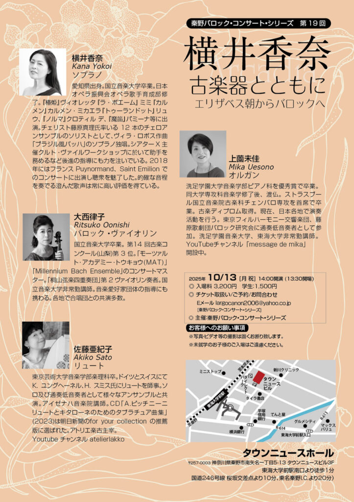 ソプラノの横井香奈さんの透明感溢れる歌声と古楽器の豊かな響きに包まれるひとときをお楽しみください