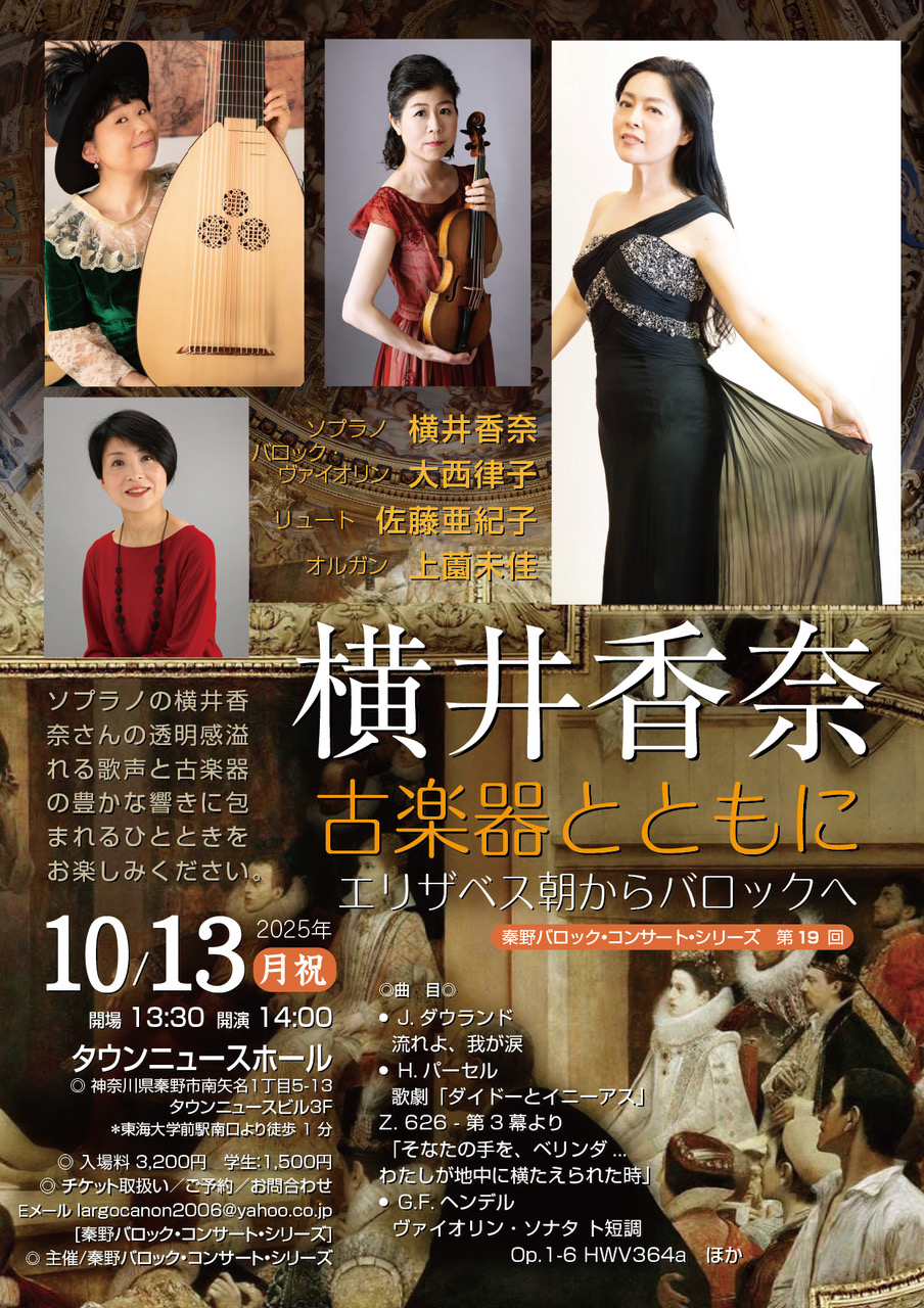 ソプラノの横井香奈さんの透明感溢れる歌声と古楽器の豊かな響きに包まれるひとときをお楽しみください