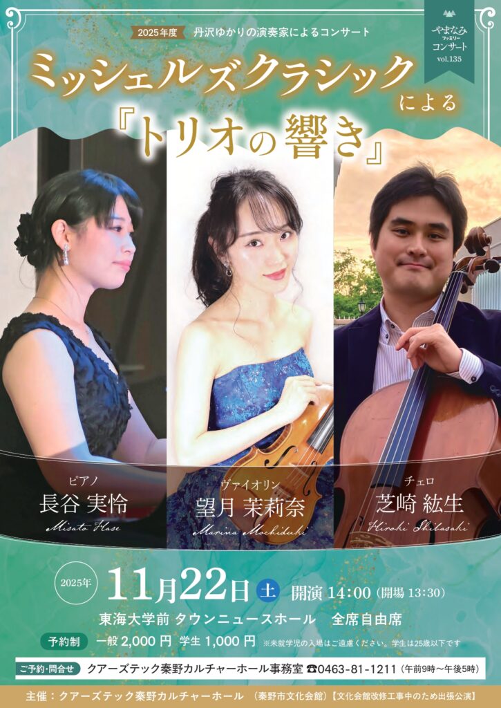 ミッシェルズクラシックによる『トリオの響き』2025年度 丹沢ゆかりの演奏家によるコンサート やまなみファミリーコンサート vol.135 「やまなみファミリーコンサート」は、秦野市文化会館が多くのみなさんに来場してもらいたいと1991年からはじめたコンサート企画です。2023年からは丹沢やまなみエリア... -