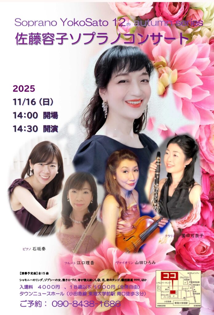 佐藤容子ソプラノコンサート【日時】2025年11月16日 日曜日 開場14:00 開演14:30 【入場料】4,000円 18歳以下 1,000円(全席自由) 【会場】タウンニュースホール(小田急線・東海大学前駅 南口徒歩2分 タウンニュースビル3F) ※駐車場には限りがありますので、公共交通機関の... -