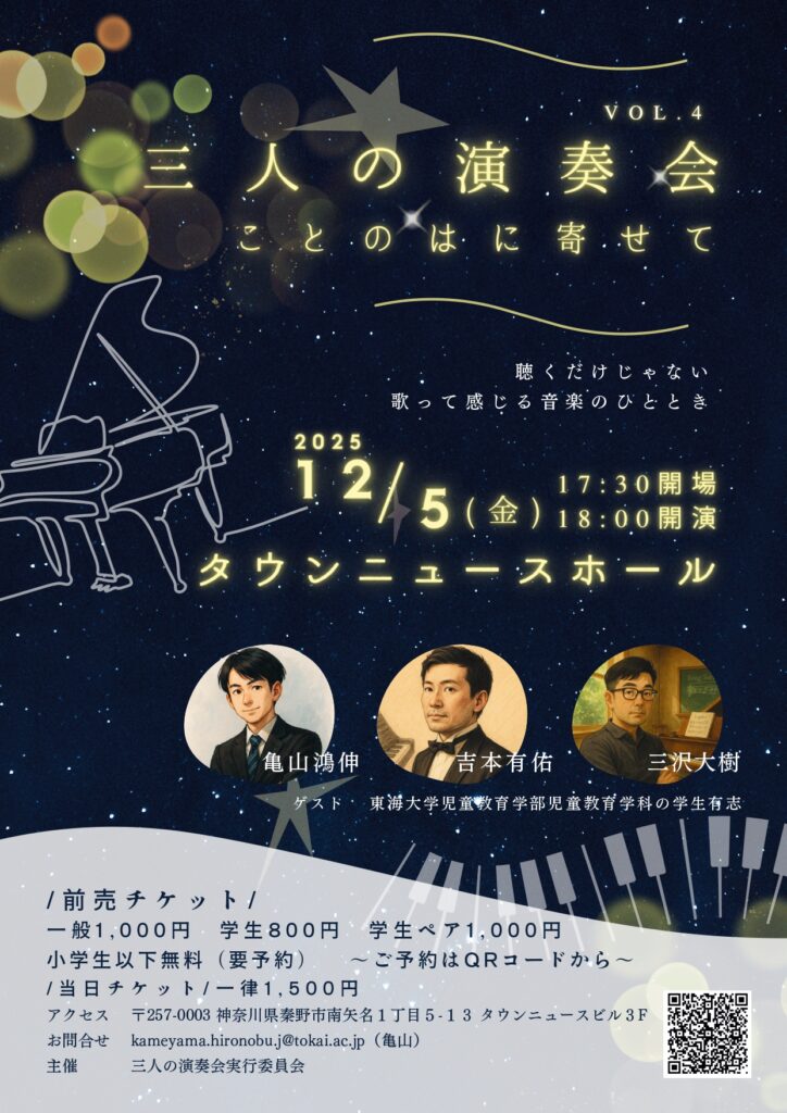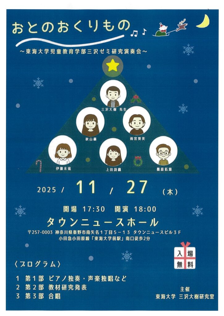 おとのおくりもの~東海大学児童教育学部三沢ゼミ研究演奏会~【日時】2025年11月27日 木曜日 開場17:30 開演18:00 【入場料】無料 【会場】タウンニュースホール(小田急線・東海大学前駅 南口徒歩2分 タウンニュースビル3F) ※駐車場には限りがありますので、公共交通機関のご利用をお願いいたします 【プログ... -