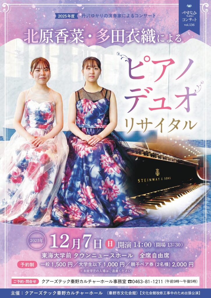北原香菜・多田衣織によるピアノデュオリサイタル2025年度 丹沢ゆかりの演奏家によるコンサート やまなみファミリーコンサート vol.136 「やまなみファミリーコンサート」は、秦野市文化会館が多くのみなさんに来場してもらいたいと1991年からはじめたコンサート企画です。2023年からは丹沢やまなみエリア... -