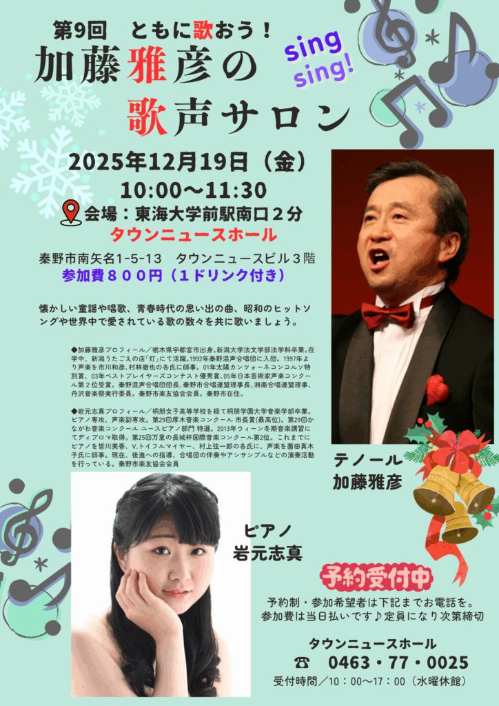 第9回 ともに歌おう!加藤雅彦の歌声サロン懐かしい童謡や唱歌、青春時代の思い出の曲、昭和のヒットソングや世界中で愛されている歌の数々をともに歌いましょう 【日時】2025年12月19日 金曜日 開場9:30 開演10:00(11:30終了予定) 【参加費】800円(1ドリンク付き) 【会場】タウンニュース... -