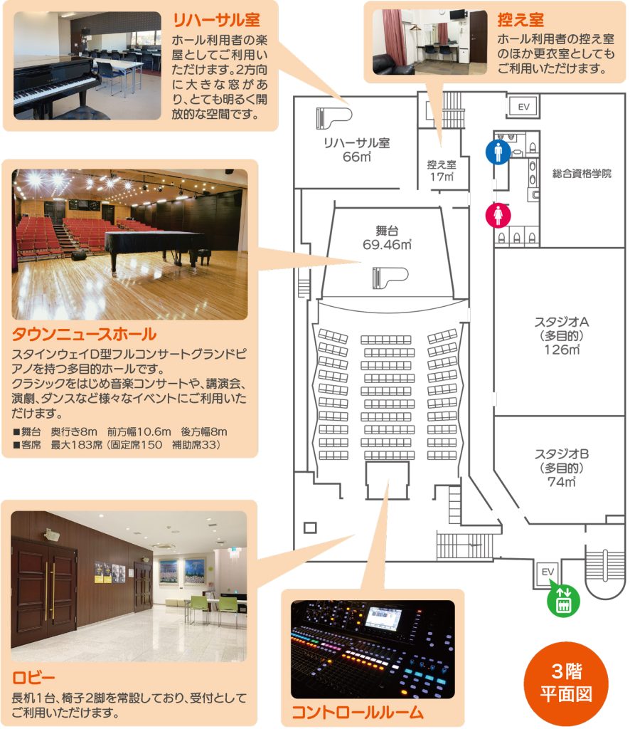 タウンニュースホールは、2012年11月に地域の文化振興に貢献することをめざしオープンした多目的ホールです。地域に開かれたホールとして、地域の方々に気軽にご利用いただけるよう、努めております。コンパクトな規模ですが、クラシックコンサート、音楽教室の発表会、地域の皆さんによるカラオケ大会などの各種イベントや地域の会合、講演会などにご利用いただいております。客席は観覧しやすい緩やかな傾斜のついたワンスロープ形式(固定席150、ご要望に応じて補助席の設置も可能)、スタインウェイのフルコンサートグランドピアノを有しています。※ホールのご利用は、ご利用希望日・ご利用内容などを打合せさせていただいた後、お使いいただいております。まずはお気軽にご相談ください。